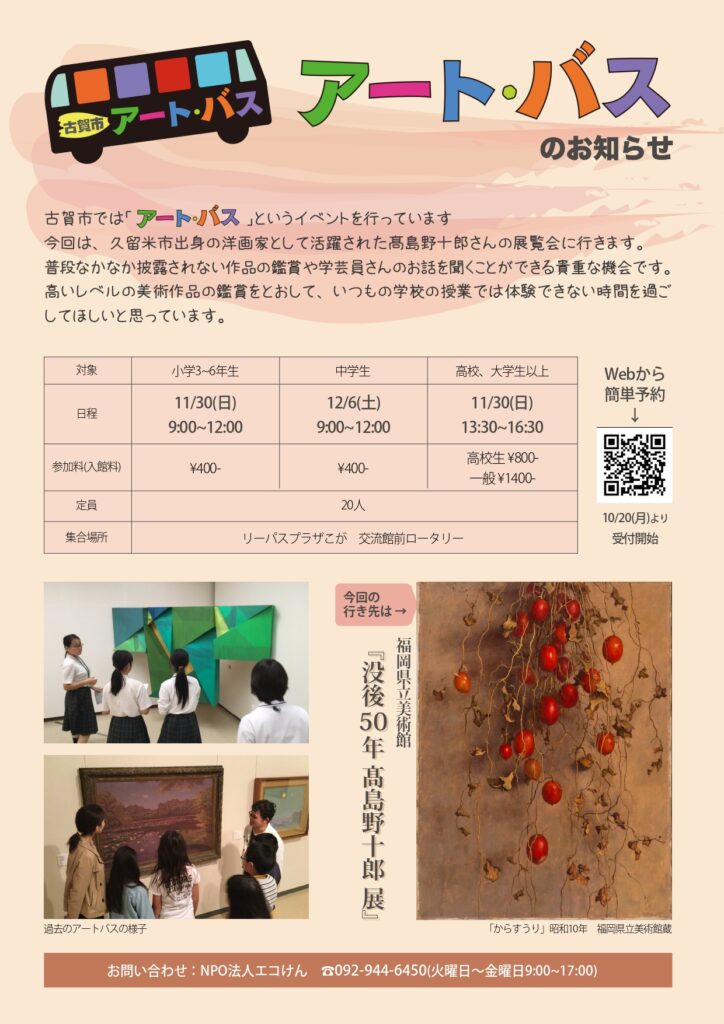 | 内容 | 今回の行先は福岡市県立美術館「没後50年 髙島野十郎 展」 久留米市出身の洋画家として活躍された髙島野十郎さんの展覧会に行きます。 普段なかなか披露されない作品の鑑賞や学芸員さんのお話を聞くことができる貴重な機会です。高いレベルの美術作品の鑑賞をとおして、いつもの学校の授業では体験できない時間を過ごしてほしいと思っています。 |