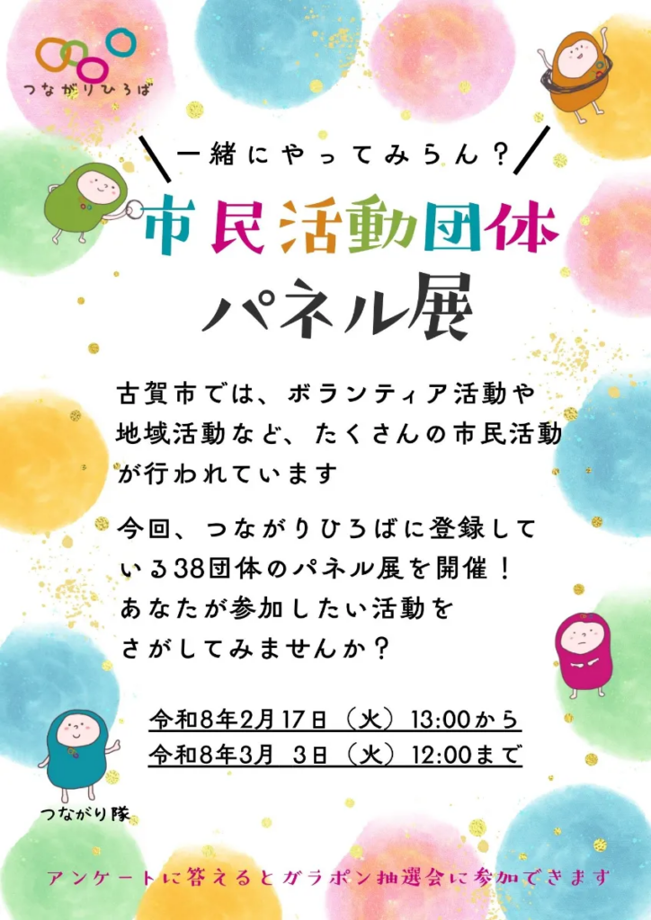 | 内容 | 古賀市では、ボランティア活動や地域活動などたくさんの市民活動が行われています。 今回、つながりひろばに登録している38団体を紹介するパネル展を開催! あなたが参加したい活動をさがしてみませんか? ♪アンケートに答えるとガラポン抽選会に参加できますよ♪ |